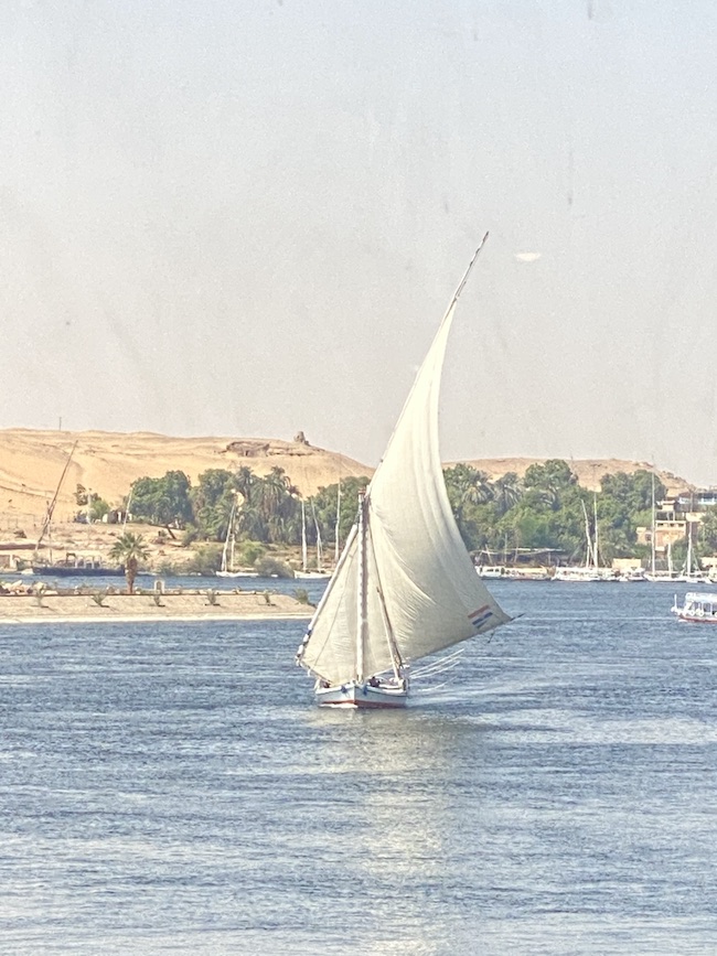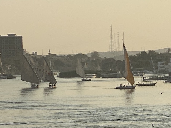 Vjetar još uvijek puše, pretežno okomito na rijeku, pa tradicionalni egipaski brodovi feluke i dalje klize površinom Nila ...