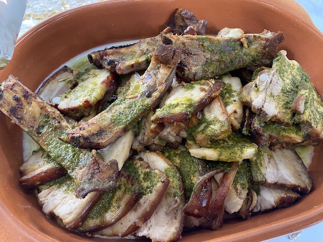 Svinjsko pečenje s umakom od mente. Svinjetina se stavi u posudu za pečenje, posoli, popari i dobro premaže maslinovim uljem, te pospe sjemenkama korijandra. Peče se na laganoj vatri (1600C) i polijeva sokom od pečenja. Služi se uz Umak od mente u koji ide svježa ili sušena menta, zeleni papar u zrnu, šafran, maslinovo ulje, vinski ocat i gorušica. Sve se zajedno zdrobi, a mjesavina treba odležati najmanje sat vremena prije nego li se prelije po mesu. Svjedok sam da je meso ovim umakom dobilo potpuno novu dimenziju.