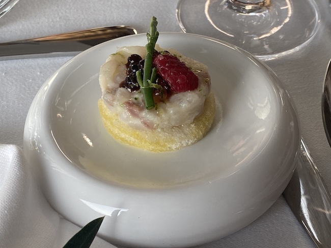 Večera je počela malim zalogajem tartarom od jadranskog brancina uz kavijar od citrusa i bobičastog voća. Uz to su mladi sommelieri izvrsno združili Pjenušac Brut Medea, 2019. iz vinogorja Istra, 100% Malvazija, Chamat metoda.