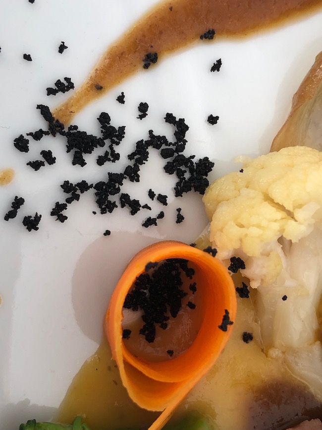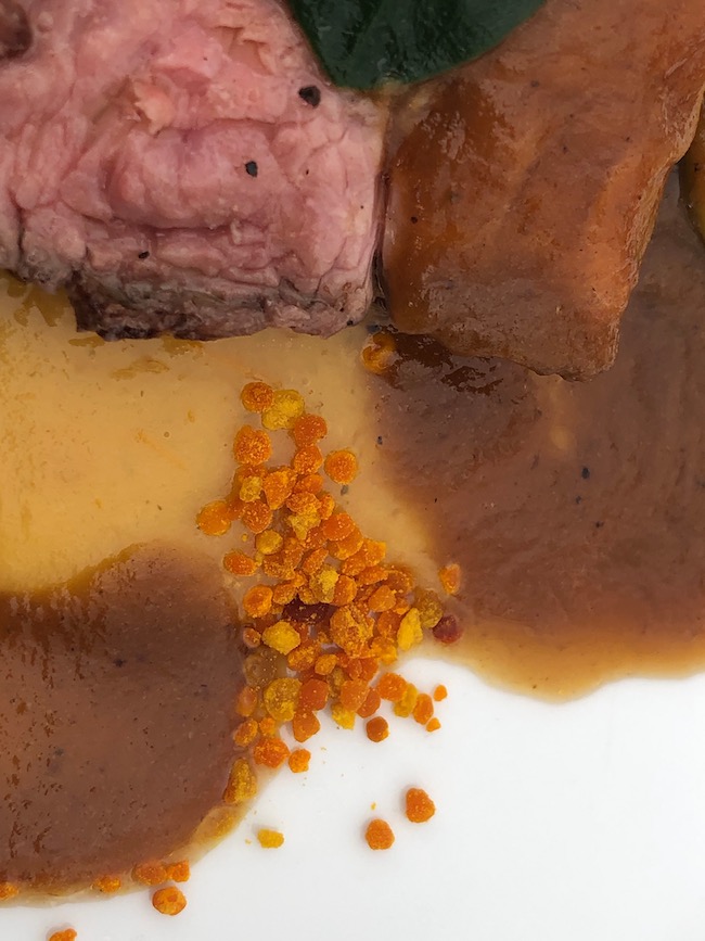 Slijedeći slijed je također bio vizualno umjetniko djelo: Odležani steak sa selekcijom povrća i salsom od žutih poma, jus, s tim da su sve namirnice kuhane na način kako je George Mateljan preporučio u svojoj knjizi.