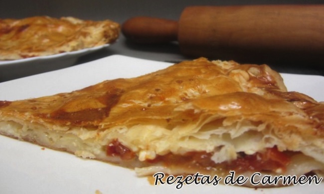 1. Prvo lisnato tijesto razvaljamo,pa na to stavimo sloj rajčice narezane na tanke ploške.