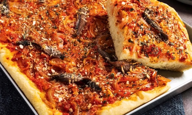 Sicilijanska verzija pizze koja često uključuje rajčicu, inćune, luk, i mrvice kruha na vrhu.