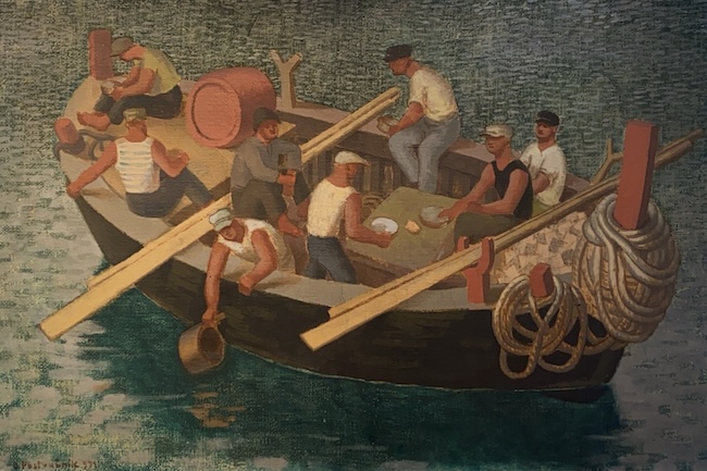 Kako se u Splitu u vrijeme pisanja ovog članka održavala izložba Koraci, izbor iz fundusa Nacionalnog muzeja moderne umjetnosti iz Zagreba, nisam mogao odoljeti da u okviru ovog članka ne prikažem i posebnu sliku slikara Otona Postužnika iz 1931.g. s naslovom Ribari iz Komiže.