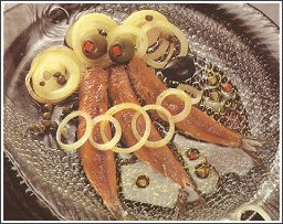 Slane srdele odlično idu i s ukiseljenim kaparima. U svakom slučaju odlično predjelo nakon kojeg se može dobro popiti. Francuzi obožavaju sva predjela s inćunima još i zvučno nazvati. Evo dva primjera koja smo posudili iz prije spomenute kuharice Rene Kramera: "Poissons et crustaces", Veen, Amsterdam en Kluwer, 1969. (prevod Jelena Muzul, Otokar keršovani, Rijeka, 1972). Slike djeluju glamurozno, ali kako ćete vidjeti u principu nisu ništa spektakularno. Bilo bi ih dobro kopirati. Kažite mi ime restorana gdje se ovakva predjela mogu dobiti ? ANCHOIS COTE D'AZUR (Inćuni Azurna obala) Za 6 osoba: 24 inćunova fileta 300 g salate od krumpira 24 smotana inćunova fileta 24 punjene masline tvrdo kuhani žumanjak i tvrdo kuhani bjelanjak (zasebno sjeckani) 1 žlica sjeckanog peršina Polovinu inćunovih fileta složimo na podlogu krompirove salate, ukrasimo porubom od sjeckanog bjelanjka i žumanjka i preostalim filetima koje smo ovili oko punjenih maslina. Pospemo sjeckanim peršinom.