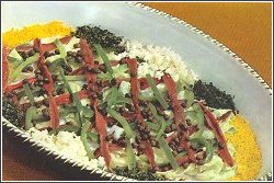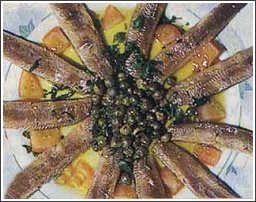 Prevodeno na hrvatski književni jezik to bi značilo: Umijesiti tijesto za kruh, brašna 1 kilogram i osamdeset, tri paketa suhoga kvasca, 1 dkg soli, malo ulja i mlake vode 2 dcl. Sastojke izmješati i zamjesiti tijesto za kruh. Ostaviti da se diže dok ne naraste tri puta veće. Nasjeckati crveni luk, peršin i oguljene rajčice, te od toga napraviti šalšu - umak od rajčica (naravno na maslinovom ulju - vidi Školu kuhanja 4). Tijesto podijeliti na dva dijela. Prvi dio razvaljati i staviti na dno posude za pečenje. Po tome prosuti šalšu, poredati očišćene slane srdele bez kosti, pokriti drugim djelom tjesta i ostaviti da se diže još pola sata (dobro ju je prekriti toplom krpom). Kod prekrivanja drugim dijelom dobro stisnuti krajeve da se umak tijekom pećenja ne bi razljevao. Gornje tijesto vilicom izbosti na dosta mjesta, pa staviti peći na 180 stupnjeva 40 do 45 minuta. Prvih 10 minuta dobro je peći na 220 stupnjeva, a ostatak vremena na 180. Nakon vađenja dobro je pogaču premazati s malo vode, opet prekriti krpom i ostaviti da se ohladi. Odlično prija sa crnom bevandom. Kad nema svježih rajčica mogu i pelati, pa čak i koncentrat od rajčice. Ako je tjesto debelo luk i rajčicu ne treba prije pirjati. Meni osobno je ipak draže kada se zažuti. Okus je drugačiji. Evo i nekoliko jela mediteranskog kruga kod kojih su slane srdele i inćuni neizostavni dio. FAGIOLI ALLA VENETA (Mahune na venecijanski) 800 g svježih mahuna 2 češnja češnjaka 2 žlice maslinovog ulja 10 filea slanih srdela ili inćuna 1 kavena šalica vinskog octa sjeckani peršin sol, papar Skuhati mahune u slabo zasoljenoj vodi. Popirjati zdrobljeni češnjak na maslinovom ulju. Dodati filete inćuna i nastaviti pirjati. Dodati vinski ocat i papar, te kuhati daljnjih 10 minuta. Posuti isjeckanim peršin, dobro izmješati i preliti po skuhanim mahunama. Napomena: Postoji i varijanta sa skuhanim suhim grahom. PENNE LISCE ALLO MANDRACCHIO (Penete na način mandrača) Tradiconalno talijansko ribarsko jelo koje pripremalo u mandračima (mali unutrašnji dio luke u kojem se drže mali brodovi). 40 g crvenog luka 32 komada svježih inćuna 4 komada slanih inćuna 4 žlice extra djevičanskog maslinovog ulja 4 oguljene rajčice 2 češnja češnjaka 2 žlice isjeckanog peršina 1/2 čaše suhog bijelog vina 1 ljuta papričica, soli Očistiti svježe i slane inćune, te im izvaditi središnju kost. Prerezati rajčice na pola. Pirjeti isjeckani crveni luk i češnjak na maslinovom ulju. Kad je omekšalo maknuti sa vatre i čekati dok se ne ohladi. Tek tada po vrhu poslagati inćune. Vratiti na jaki plamen i kuhati minutu, dvije, dodati rajčice i na jakom plamenu kuhati još slijedećih nekoliko minuta. Preliti po skuhanim penetama i posuti peršinom. Zanimljivi recept sa penetama pronašli smi i u Posluhovoj kuharici ( www.posluh.hr/predah/kuharica ), probali ga i dosta nam se svidio, pa vam ga prenosimo: PENETI U ĐAVOLJEM UMAKU 40 dag tjestenine "peneti" 50 dag zrelih rajčica 50 dag paprika 4 češnja češnjaka 2 žlice crnih maslina 2 očišcene slane srdele 0.5 čaše svijetlog piva žlicica kapara malo crvene paprike u prahu 3 žlice mslinovog ulja bosiljak sol U tavu ulijte ulje, dodajte češnjak i nakon minutu-dvije dodajte na tanke rezance rezanu papriku, rajčicu, masline, kapare, listiće bosiljka, slane ribe, sol i crvenu papriku. Nakon par minuta ulijte pivo i kuhajte dok ne dobijete gusti umak. Gotov umak prelijte preko kuhanih peneta i odmah poslužite. Slijede recepti za još dvije tjestenine. Prva je tradicionalno napolitansko jelo koje se služilo na Badnjak. LINGUINE ALLA ACCIUGHE (Linguine sa slanim inćunima) U receptu originalno dolazi tjestenina linguine, plosnata uska verzija spaghetta, koja se često zove i tagliatelle ili bavette. Ako je nemate dobro će doći i klasični spaghetti ili malo tanji vermicelli. 2/3 šalice maslinovog ulja 2 češnja češnjaka 100 g slanih inćuna isjeckani peršin papar 0,5 kg tjestenine linguine Skuhati tjesteninu prema upustvu na omotu. Dok se kuha napraviti umak. Pirjati češnjak samo prerezan na dva dijela na maslinovom ulju. Kad posmeđi izvaditi ga. Dodati peršin i inćune zajedno sa par žlica vode u kojoj se kuha tjestenina. Smanjiti vatru i pirjati dok se fileti ne stope s uljem. Popariti i preliti po tjestenini. Vratiti na vatru još par sekundi i poslužiti. Drugo jelo s tjesteninom je sicilijansko a zove se jednostavno BUCATINI ALLE SARDE (Bucatini sa srdelama) Bucatini su spaghetti s rupom u sredini. Za ovo jelo treba domaći aromatični koromač (finochio). 1 kg korjena domaćeg koromača (finochia) 3 slana inćuna, očišćene i filetizirane 1/2 kg svježih srdela 1 manji crveni luk pola šalice maslinovog ulja 50 g pinjola 50 g grožđica malo šafrana 600 g bucatinia Skuhati koromač u velikoj količini malo zasoljene vode. Ocjediti što je više moguće (pritisnuvši svaki korjen vilicom). Isjeckati i staviti sa strane. U tavi pirjati isjeckani crveni luk dok ne omekša. Ubaciti filete inćuna i pirjati dok se skroz ne rastope. Očistiti srdele, izvaditi kost, isjeckati ih na komadiće i dodati luku i inćunima. kad požute dodati koromač, sol i papar i kuhati 5 minuta na slabom plamenu. Na kraju dodati pinjole, grožđice i šafran. Skuhati tjesteninu u vodi u kojoj se kuhao koromač, ali tako da bude malo tvrđa (all'dente). Ocjeđenu tjesteninu preliti umakom i ostaviti najmanje 10 minuta. Jelo je još bolje ukoliko se potpuno ohladi. Za one koji vole meso evo još jedan sicilijanski recept, nešto kao Vittello tonnato, ali malo složenije i s većim udjelom slane ribe. Jelo je specifičnog i jakog okusa. Meni je osobno drago, a neko ga ne može niti smisliti: "Kuhana teletina sa slanim srdelama i tunjevinom, pa što je Vama, molim lijepo ?" VITTELLO CON ACCIUGHE E TONNATO (Teletina sa slanim srdelama i tunjevinom) 1 kg nemasne teletine bez kosti u jednom komadu (npr. teleća prsa) 8 velikih fileta slanih inćuna ili srde
