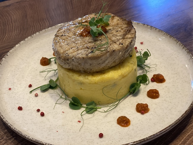 Odrezak sabljarke s palentom i ljutikom, kremom od inćuna i kapara.