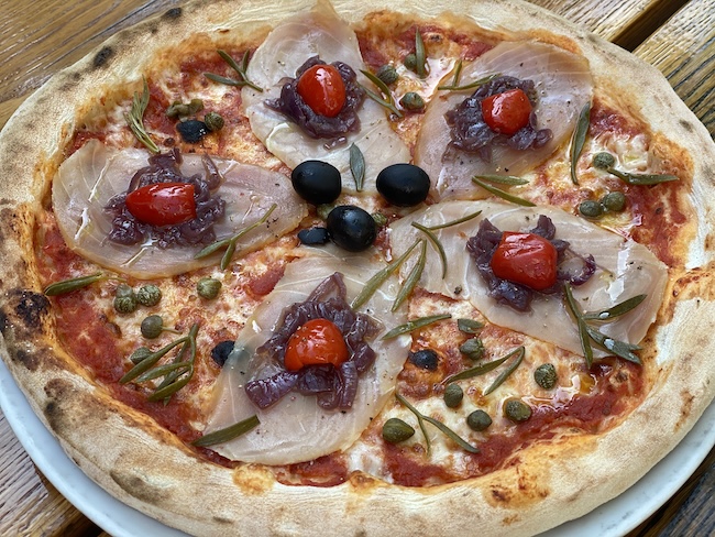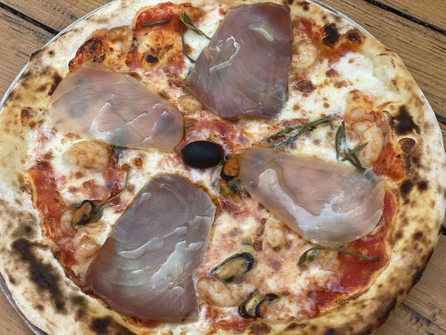 Pizza dima (umak od rajčice, mozzarella, dimljeni pršut od tune, dimljena sabljarka, dimljene dagnje, marinirane kozice, motar, ekstra djevičansko maslinovo ulje).