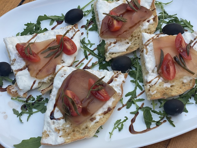 Bruschette s dimljenom sabljarkom i tunom, motrom i emulzijom od prošeka i aceta balsamica.