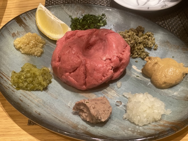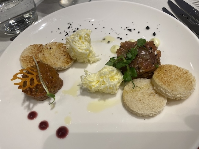 Ribarski pijat (pašteta od tune u ovitku od pršuta, inćini marinirani i slani, tartar od tune) upareno s izvrsnim tatarskim biftekom Marine Kornati ...