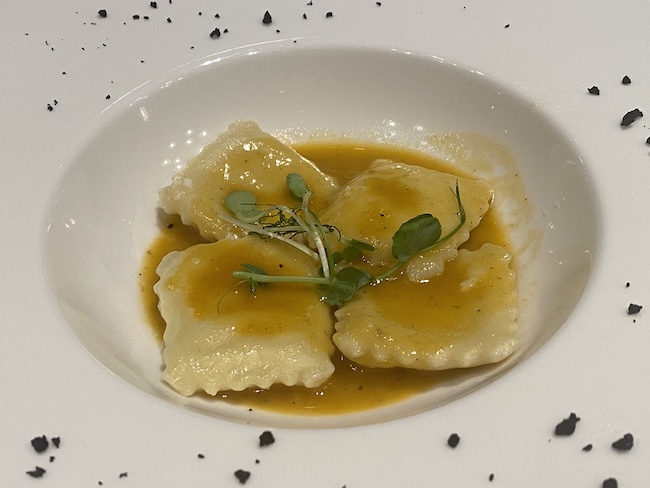 Ravioli punjeni oboritom ribom i paškom skutom u ribljem demiglaceu.