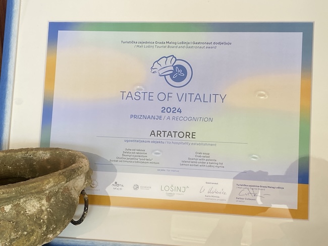 Certifikat Taste of Vitality su dobili za Juhu od rakova; Salatu od rakovice; Škampe s polentom; Otočnu janjetinu "pod teću" i Sorbet od limuna s lošinjskom mirtom. Jela su pratila vina vinarije Pilato i Drago distribucije: pjenušac Rose vinarije Kolarić - Coletti; Malvazija Pilato; Plavac mali vinarije Katunar.