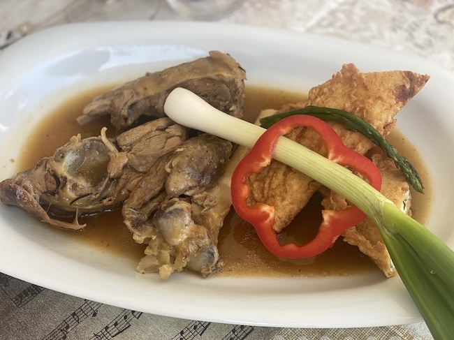 Otočna janjetina "pod teću" je jelo pripremljeno s kapulom, mrkvom, češnjakom, začinima i crvenim vinom, posluženo s palačinkom punjenom skutom i divljim šparogama.