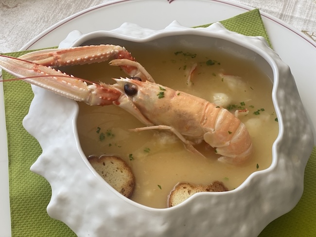 Juha od rakovica, kvarnerskih škampa i kozica, s lukom, mrkvom i češnjakom začinjena bijelim vinom, maslinovim uljem, biljnim vrhnjem i konjakom, poslužena sa svježim peršinom i domaćim dvopekom.