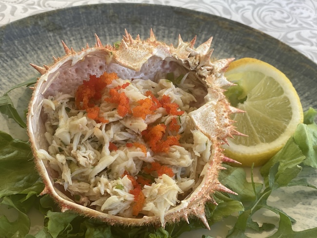 Salata od rakovice - Svježa delicija, pripremljena od očišćenog mesa rakovice, začinjena s malo maslinovog ulja i limunovim sokom, servirana u oklopu rakovice na listu zelene salate, uz tople integralne kruhiće.