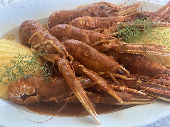 Škampi pirjani u umaku od rajčice, kapule, mrkve, češnjaka, peršina, origana i bosiljka, zaliveni vinom te posluženi uz palentu.