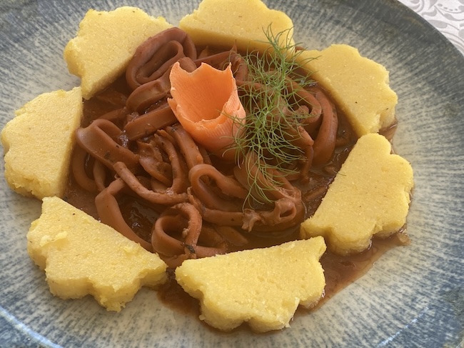 Lignje na brudet - Pirjani kolutići lignje na maslinovom ulju s kapulom, češnjakom, peršinom i rajčicom, zaliveni vinom posluženi uz palentu kuhanu s dodatkom maslinovog ulja i origana.