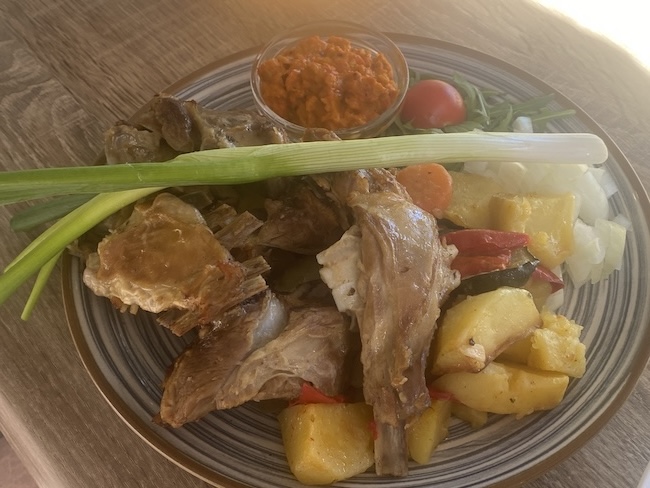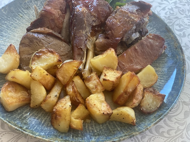Pečena janjetina - Tradicionalno jelo s otočnom janjetinom pečenom u pećnici, posluženo s krumpirom i svježim mladim lukom.