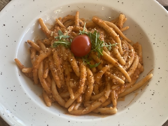 Pljukanci Amalfi u umaku od rajčica s lošinjski biljem i bademima.