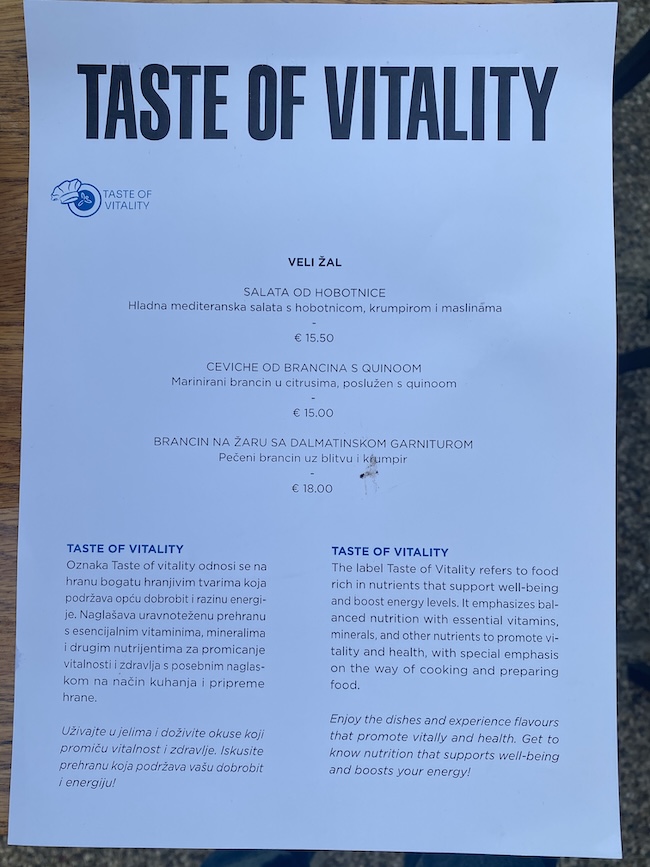 Taste of Vitality su dobili za Carpaccio od zubaca; Sirovi lošinjski škampi; Paleta morskih delicija i tekstura; Riblji brodet na otočki; Domaći pljukanci s plodovima mora. Gastronomsku ponudu prate Malvazija vinarije Benvenuti i Rose vinarije Galić.