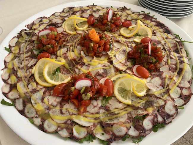 Rolana hobotnica - Kuhana i prešana lošinjska hobotnica, poslužena na rukoli i salati od cherry rajčica i bijelog graha, začinjena emulzijom limuna i maslinovog ulja te aromatizirana mješavinom lošinjskih trava.