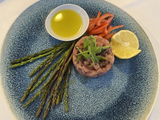 Tartar od plavorepe tune s divljim šparogama - File tune narezan na sitne kockice, začinjen otočnim maslinovim uljem te poslužen s divljim šparogama, rajčicom, svježom mentom i limunovim sokom.