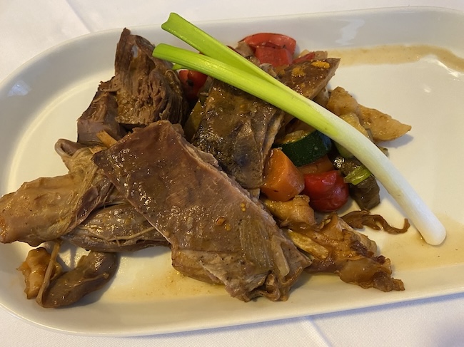 Gulaš od cresko-lošinjske divljači - Robustno jelo koje kombinira meso vepra, jelena i muflona, sporo kuhano s korjenastim povrćem, koncentratom rajčice, crvenim vinom i čokoladom, servirano uz aromatiziranu palentu s lošinjskim travama i parmezanom.
