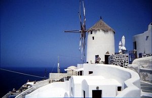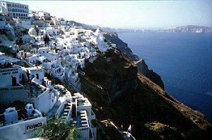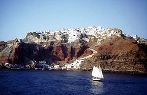 Ostavivši SING-SING u luci IOSA, odjurili smo lokalnim hidrigliserom do još južnijeg otoka THIRA - SANTORIN. Thira je prirodni fenomen: ostatak i svjedočanstvo strašne vulkanske kataklizme u antičko doba, eksplozije cijelog otoka, koja je uništila gotovo svu tadašnju visokorazvijenu otočnu civilizaciju. Na rubu ostatka kratera, iznad duboke provalije što se ruši u dubinu mora, smjestio se blistavo-bijeli gradić, doslovce okupiran turizmom! Mario i ja cijeli smo dan šetali i vozili se otokom (lokalni autobusi fenomenalno funkcioniraju!) snimajući i uživajući u zaista nevjerojatnim vizualnim kontrastima: crno vulkansko kamenje, modro more i nebo, bijele kuće Ciklada....Neponovljivo... Neopisivo! Šteta je da THIRA nema nikakve luke, tako da jahte rijetko zalaze ovamo.