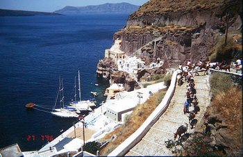 Između grada gore, visoko, na rubu vulkana i "luke" dolje, saobraćaju turistički magarčići! Postoji doduše i moderna žičara, ali je magareća romantika popularnija! |
