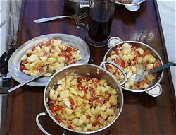 Dva dana jesti suhu hranu i sendviče malo je previše, pa je za weekend krstarenje potrebno planirati bar jedan kuhani obrok dnevno. U stvari bolje bi bilo kazati dokuhani ili podgrijani obrok. Glavno jelo se prigotovi kući i na brod ponese u hermetičkim posudama, a na brodu se samo dokuhaju prilozi (tjestenina, riža, krumpir). Tipičan primjer je umak od mesa ili rajčica, kojim se prelije svježe skuhana tjestenina, ili toć od mesa za gulaš, a na brodu dokuhati krompire. Meni su ljeti posebno drage ljetne salate od riže (vidi okvir).