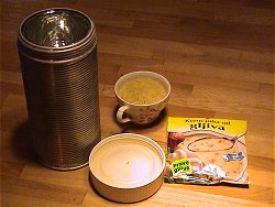 U okviru možete pronaći uputstvo i foto ilustracije kako pripremati rižu po principu "vakuum posude". Za to prije svega treba, odgovarajuća vakuum posuda. Najbolja je ona širokog grla koju prikazuje slika. Ona je sastavni dio opreme mog broda. Iako joj je osnovna svrha čuvanje kockica leda (koje redovito izmolimo u prvom kafiću mjesta u kojem se iskrcamo), odlično dođe i za kuhanje po principu "vakuum posude".