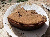 A što je sa kruhom? On je ipak centralni proizvod ovog lonca. U okviru je originalni recept zagrebačkog kovinopojasara i foto strip kako je sve skupa izgledalo kada se pekao kruh od integralnog (graham) brašna. Više manje su slijeđena uputstva, osim što je dodano puno više mlake vode (skoro 1.2 l). Peklo se 1 sat i 40 minuta. Treba paziti da je vatra skroz lagana. Lako zagori po rubovima.