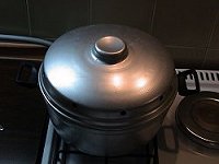 Nedavno sam slučajno u Splitu nabasao na isti takav lonac samo veći, promjera 28 cm. Cijena je bila prihvatljiva, 115 kn, pa se, sjećajući se nedostataka manjeg lonca, nisam dvoumio. Novi lonac je u osnovi bio vrlo sličan, malo drugačijeg oblika poklopca i nedostajao mu je dodatni aluminijski tuljac. Kazali su mi da je on suvišan i da se više u kompletu ne isporučuje.