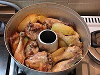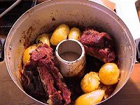 ![]() Lonac se naulji, poslažu se meso i krumpiri, posoli, a ja stavim i malo zdrobljenog češnjaka, bijelog papra, mažurana i ružmarina . Ukusno je (provjereno) i sa Kotanye-vim miksom za pečenu piletinu. Bez poklopca se stavi na zaštitni lim i pripazi da sjedne točno u utor. |
