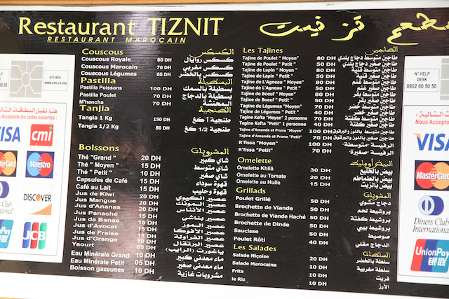 a koliko sve to dođe najbolje pokazuje jedan tipični cijenik iz Marrakecha. 1 markanski dirham je cca. 0,7 hrvatskih kuna, što znači da najskuplji tagine dođe 70 kn (100 dirhama), ali je prosjećan tagine 49 kn za 2 osobe (70 dirhama).