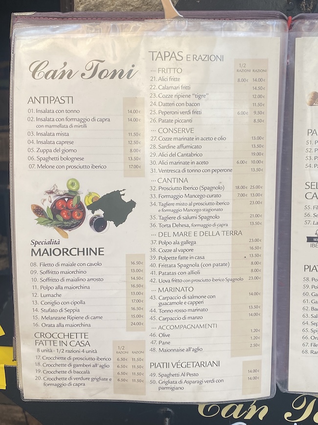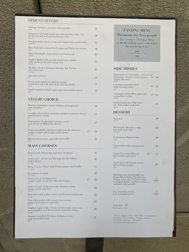 Evo i njegovog cjenika iz kojeg se vidi da cijene nisu velike. Čini mi se čak i manje nego u Splitu. Najskuplje jelo je Orada na način Mallorce 24 EUR.