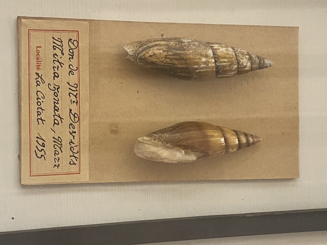posebno malakološka zbirka. Na slici je Mitra zonata, jedna od najrjeđih mediteranskih (i jadranskih) školjki. Kako na etiketi piše ova je ulovljena 1955.g. na lokaciji La Ciotat.