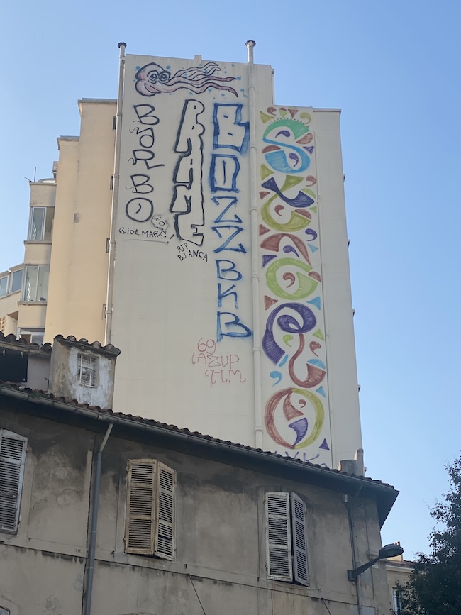 I fasade su u stilu kvarta, a mene posebno zanima kako su napisani ovi grafiti? Da li su umjetnici visili na konopu ili su iskoristili skelu dok se bojala fasada.