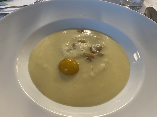 Toplo predjelo je bilo austrijski doprinos odlična Krem juha od žutih rajčica s krutonima od kruha i žutom rajčicom uz isti Pošip Brime Rizvan.