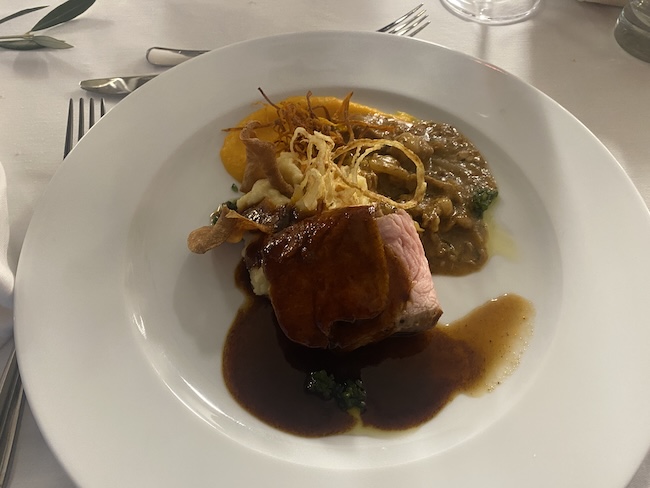 Glavno jelo je sito tako bio austrijski doprinos - Teleći odrezak, teleći ragu uz pire od pastrnjaka i kratko prženo povrće. Uz to se sljubio Merlot Medea 2023. iz vinogorja zapadna Istra.