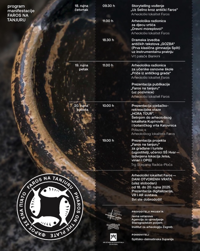 Od 17. - 20.09.2025. u Starom Gradu na Hvaru održana je završna promocija projekta Faros na tanjuru koju bi na novom grčkom nazvali Φάρος σε ένα πιάτο (Fáros se éna piáto), a na staro grčkom Φάρος ἐπὶ πίνακι (Pháros epì pínaki). Projekt je imao imao kao glavni cilj rekonstrukciju prehrane starih Grka na Hvaru kroz analizu njihovih običaja i integraciju s lokalnim prehrambenim praksama, a promocija je bila i prilika pokazati zanimljivosti grčkih arheoloških ostataka na Hvaru, posebno u starogradskom polju.