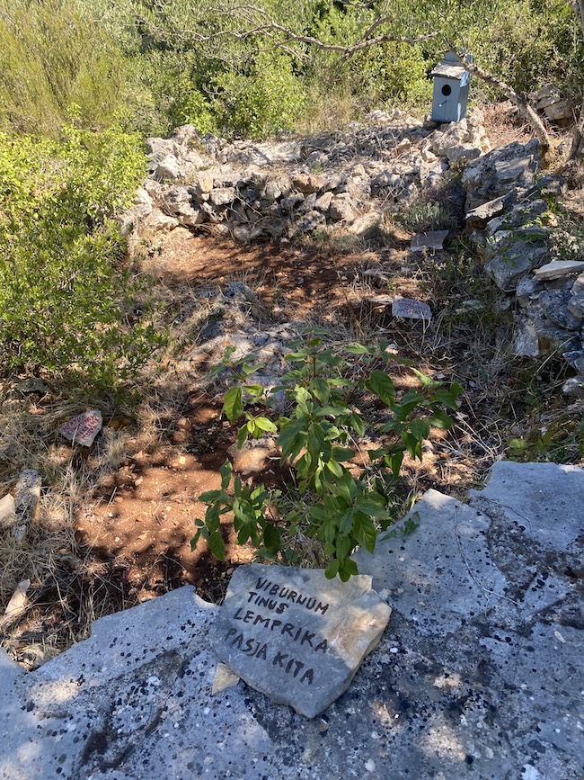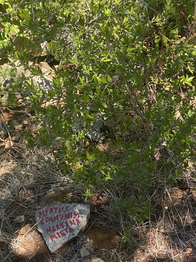 Osim tradicionalnih „kultiviranih“ biljaka: lavande i masline, uzgojio je veliki broj autohtonih samoniklih biljaka karakterističnih za ovo područje, kao što su ruzmarin, kadulja, vrisak, buhač, brnistra, pistacija, mirta, planika, majčina dušica, matičnjak, kozokrvina i mnoge druge. Uz svaku od ovih biljaka na kamenim pločama ispisana su njihova imena na hrvatskom i latinskom jeziku, te otočnom dijalektu. Ovu mirtu je očito zasadila Marta.
