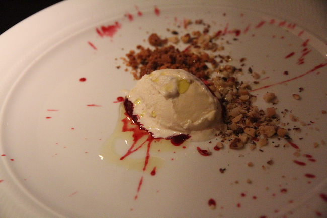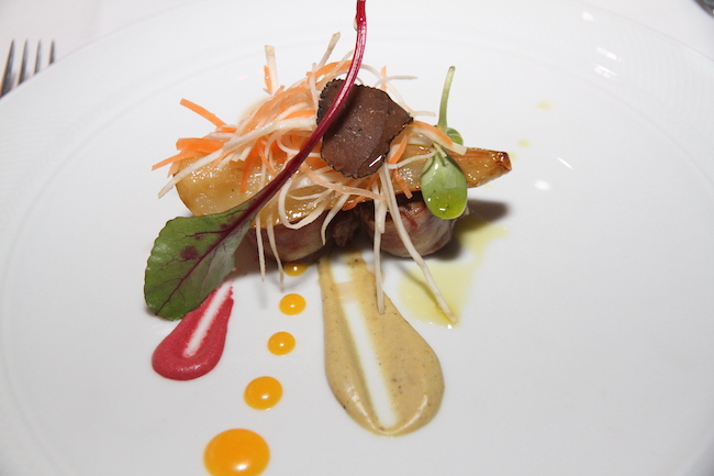 Prvi slijed chefa Nikole Eterovića: Janjeći file, istarska panceta frajerica, korijen celera, poriluk, cvijet soli, majčina dušica, cvijet ružmarina i cvijet murtile, menta, citrusno voće, agrumi, svježi crni tartufi, med, mini kruška uz Medea Malvazija 2017.
