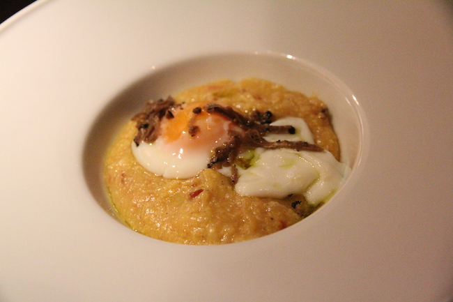 Treći slijed chefa Nikole Eterovića: Domaća palenta, Lečevačko domaće tučeno maslo, dehidrirane marinirane cherry rajčice - organski uzgoj, mlada kapula, svježi crni tartif, jaje 60 minuta kuhano u sous vide na 600C, cvijet himalajske soli uz odležanu Medea Monitron malvaziju 2016.