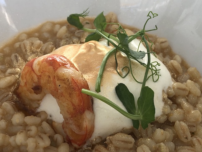 Orzoto s bisqueom od škampa i pečenim kozicama, pjena od češnjaka, jestivo zlato uz ...