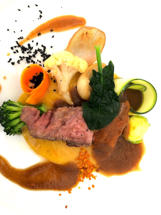Slijedeći slijed je također bio vizualno umjetniko djelo: Odležani steak sa selekcijom povrća i salsom od žutih poma, jus, s tim da su sve namirnice kuhane na način kako je George Mateljan preporučio u svojoj knjizi.