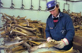 Ribarski brodovi su relativno mali i imaju posadu od 1 do 2 ribara. Skrei je na dubini od 80 metara. Ima ga puno, pa lov i nije toliko težak. Čim se donese na obalu ribi se reže glava, pusti se krv, po dvije ribe se vežu repovima i postavljaju na drvene nosaće gdje se suši samo na suncu i vjetru. Za razliku od portugalskog postupka riba se prije sušenja ne soli. Poslije 2 mjeseca, na početku lipnja riba je izgubila više od 80% i postala torrfisk . Za vrijeme sušenja cijeli Lofoten miriše (da ne kažemo smrdi) po ribi, pa ga putnici namjernici uglavnom izbjegavaju. Osušena riba se pažljivo ručno klasira, veže u bale, pohranjuje u skladišta i uglavnom izvozi. Stanovnicima Lofotena rađe jedu meso, što je i razumljivo. Od bakalara svježi jezik je jedino u čemu uživaju. Kažu da su jezici prvorazredan specijalitet ali da se moraju pripremati skroz svježi. Na žalost nismo ih imali prilike probati, pa nam jedino ostaje vjerovati stanovnicima Lofotena. Slike u nastavku su uz dozvolu sa sita o Lofotenu .