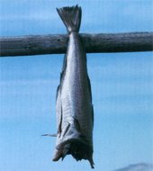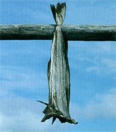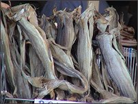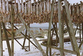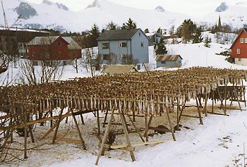 | Bakalar se suši na drvinim nosačima. | U doba sušenja cijeli Lofoten smrdi po ribi. |