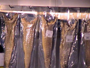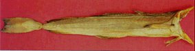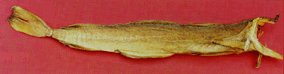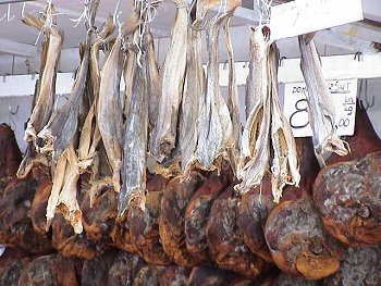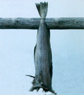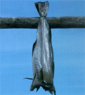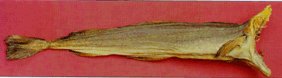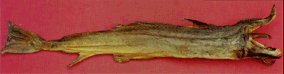 | Slike po redu s lijeva na desno: 1. Svježe očišćeni bakalar. Idealna temperatura sušenja je 5oC. Sušenje ne smije biti previše naglo. 2. Poluosušeni bakalar - boknafisk . Bakterije i vlstiti riblji enzimi mijenjaju proteine. Specijalitet na sjeveru. 3. Skori potpuno osušen - hjelosing . Isto tako delicija. Riba je na površini potpuno osušena. 4. Nakon 2 mjeseca riba je potpuno osušena. Na koži bakalara stvara se enzim lysozyme koji ubija mikroorganizme i spriječava kvarenje i truljenje ribe. |