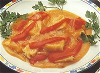 U drugoj posudi kratko zažutiti na malo maslinovog ulja drugi češanj češnjaka (također isjeckani). Dodati isprane kućice, sjeckani peršin i bijelo vino. Pokriti i kuhati dok se kućice ne otvore. Dodati repove kozica te prokuhati daljnja 3 minuta. Preliti ovaj umak po grahu, pomiješati, kuhati još 5 minuta i servirati. MIJEŠANO POVRĆE (Panaché de Verduras) 1 kg različitog povrća (mrkve, mahuna, kavula, kupusina, biži) 0.15 kg malih očišćenih škampi 3 jaja 1 crveni luk 1 šalica (0.25 l) mesne juhe (može i iz kockice) suhog sherrya maslinovo ulje, sol, papar