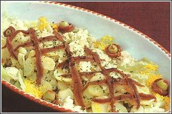 Prevodeno na hrvatski književni jezik to bi značilo: Umijesiti tijesto za kruh, brašna 1 kilogram i osamdeset, tri paketa suhoga kvasca, 1 dkg soli, malo ulja i mlake vode 2 dcl. Sastojke izmješati i zamjesiti tijesto za kruh. Ostaviti da se diže dok ne naraste tri puta veće. Nasjeckati crveni luk, peršin i oguljene rajčice, te od toga napraviti šalšu - umak od rajčica (naravno na maslinovom ulju - vidi Školu kuhanja 4). Tijesto podijeliti na dva dijela. Prvi dio razvaljati i staviti na dno posude za pečenje. Po tome prosuti šalšu, poredati očišćene slane srdele bez kosti, pokriti drugim djelom tjesta i ostaviti da se diže još pola sata (dobro ju je prekriti toplom krpom). Kod prekrivanja drugim dijelom dobro stisnuti krajeve da se umak tijekom pećenja ne bi razljevao. Gornje tijesto vilicom izbosti na dosta mjesta, pa staviti peći na 180 stupnjeva 40 do 45 minuta. Prvih 10 minuta dobro je peći na 220 stupnjeva, a ostatak vremena na 180. Nakon vađenja dobro je pogaču premazati s malo vode, opet prekriti krpom i ostaviti da se ohladi. Odlično prija sa crnom bevandom. Kad nema svježih rajčica mogu i pelati, pa čak i koncentrat od rajčice. Ako je tjesto debelo luk i rajčicu ne treba prije pirjati. Meni osobno je ipak draže kada se zažuti. Okus je drugačiji. Evo i nekoliko jela mediteranskog kruga kod kojih su slane srdele i inćuni neizostavni dio. FAGIOLI ALLA VENETA (Mahune na venecijanski) 800 g svježih mahuna 2 češnja češnjaka 2 žlice maslinovog ulja 10 filea slanih srdela ili inćuna 1 kavena šalica vinskog octa sjeckani peršin sol, papar Skuhati mahune u slabo zasoljenoj vodi. Popirjati zdrobljeni češnjak na maslinovom ulju. Dodati filete inćuna i nastaviti pirjati. Dodati vinski ocat i papar, te kuhati daljnjih 10 minuta. Posuti isjeckanim peršin, dobro izmješati i preliti po skuhanim mahunama. Napomena: Postoji i varijanta sa skuhanim suhim grahom. PENNE LISCE ALLO MANDRACCHIO (Penete na način mandrača) Tradiconalno talijansko ribarsko jelo koje pripremalo u mandračima (mali unutrašnji dio luke u kojem se drže mali brodovi). 40 g crvenog luka 32 komada svježih inćuna 4 komada slanih inćuna 4 žlice extra djevičanskog maslinovog ulja 4 oguljene rajčice 2 češnja češnjaka 2 žlice isjeckanog peršina 1/2 čaše suhog bijelog vina 1 ljuta papričica, soli Očistiti svježe i slane inćune, te im izvaditi središnju kost. Prerezati rajčice na pola. Pirjeti isjeckani crveni luk i češnjak na maslinovom ulju. Kad je omekšalo maknuti sa vatre i čekati dok se ne ohladi. Tek tada po vrhu poslagati inćune. Vratiti na jaki plamen i kuhati minutu, dvije, dodati rajčice i na jakom plamenu kuhati još slijedećih nekoliko minuta. Preliti po skuhanim penetama i posuti peršinom. Zanimljivi recept sa penetama pronašli smi i u Posluhovoj kuharici ( www.posluh.hr/predah/kuharica ), probali ga i dosta nam se svidio, pa vam ga prenosimo: PENETI U ĐAVOLJEM UMAKU 40 dag tjestenine "peneti" 50 dag zrelih rajčica 50 dag paprika 4 češnja češnjaka 2 žlice crnih maslina 2 očišcene slane srdele 0.5 čaše svijetlog piva žlicica kapara malo crvene paprike u prahu 3 žlice mslinovog ulja bosiljak sol U tavu ulijte ulje, dodajte češnjak i nakon minutu-dvije dodajte na tanke rezance rezanu papriku, rajčicu, masline, kapare, listiće bosiljka, slane ribe, sol i crvenu papriku. Nakon par minuta ulijte pivo i kuhajte dok ne dobijete gusti umak. Gotov umak prelijte preko kuhanih peneta i odmah poslužite. Slijede recepti za još dvije tjestenine. Prva je tradicionalno napolitansko jelo koje se služilo na Badnjak. LINGUINE ALLA ACCIUGHE (Linguine sa slanim inćunima) U receptu originalno dolazi tjestenina linguine, plosnata uska verzija spaghetta, koja se često zove i tagliatelle ili bavette. Ako je nemate dobro će doći i klasični spaghetti ili malo tanji vermicelli. 2/3 šalice maslinovog ulja 2 češnja češnjaka 100 g slanih inćuna isjeckani peršin papar 0,5 kg tjestenine linguine Skuhati tjesteninu prema upustvu na omotu. Dok se kuha napraviti umak. Pirjati češnjak samo prerezan na dva dijela na maslinovom ulju. Kad posmeđi izvaditi ga. Dodati peršin i inćune zajedno sa par žlica vode u kojoj se kuha tjestenina. Smanjiti vatru i pirjati dok se fileti ne stope s uljem. Popariti i preliti po tjestenini. Vratiti na vatru još par sekundi i poslužiti. Drugo jelo s tjesteninom je sicilijansko a zove se jednostavno BUCATINI ALLE SARDE (Bucatini sa srdelama) Bucatini su spaghetti s rupom u sredini. Za ovo jelo treba domaći aromatični koromač (finochio). 1 kg korjena domaćeg koromača (finochia) 3 slana inćuna, očišćene i filetizirane 1/2 kg svježih srdela 1 manji crveni luk pola šalice maslinovog ulja 50 g pinjola 50 g grožđica malo šafrana 600 g bucatinia Skuhati koromač u velikoj količini malo zasoljene vode. Ocjediti što je više moguće (pritisnuvši svaki korjen vilicom). Isjeckati i staviti sa strane. U tavi pirjati isjeckani crveni luk dok ne omekša. Ubaciti filete inćuna i pirjati dok se skroz ne rastope. Očistiti srdele, izvaditi kost, isjeckati ih na komadiće i dodati luku i inćunima. kad požute dodati koromač, sol i papar i kuhati 5 minuta na slabom plamenu. Na kraju dodati pinjole, grožđice i šafran. Skuhati tjesteninu u vodi u kojoj se kuhao koromač, ali tako da bude malo tvrđa (all'dente). Ocjeđenu tjesteninu preliti umakom i ostaviti najmanje 10 minuta. Jelo je još bolje ukoliko se potpuno ohladi. Za one koji vole meso evo još jedan sicilijanski recept, nešto kao Vittello tonnato, ali malo složenije i s većim udjelom slane ribe. Jelo je specifičnog i jakog okusa. Meni je osobno drago, a neko ga ne može niti smisliti: "Kuhana teletina sa slanim srdelama i tunjevinom, pa što je Vama, molim lijepo ?" VITTELLO CON ACCIUGHE E TONNATO (Teletina sa slanim srdelama i tunjevinom) 1 kg nemasne teletine bez kosti u jednom komadu (npr. teleća prsa) 8 velikih fileta slanih inćuna ili srde